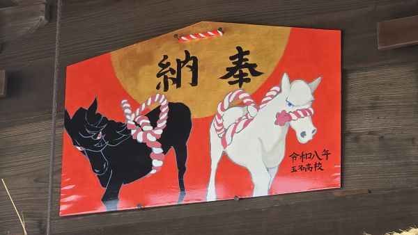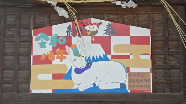 2000年から続いている疋野神社への絵馬奉納です。最初は荒玉地区の5校で始まった奉納も、今年は高校7校(玉高、北稜、玉名女子、専大熊本玉名、有明、有明高専、鹿本農)、中学4校(玉高附属中、玉名中、岱明中、荒尾四中)、おおくらの森保育園、おおくらの森幼稚園の美術部、同好会などが作成した14枚の絵馬が社殿に飾られています。