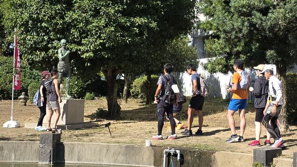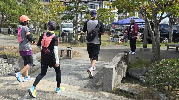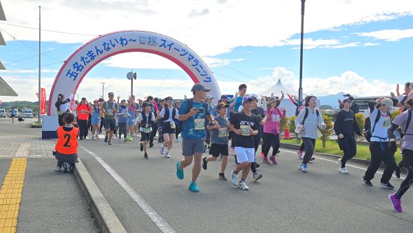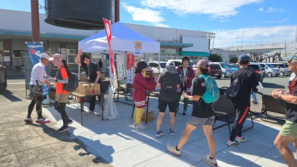 2025年10月26日(日)、玉名たまんないスーツマラニックが開催され、玉名高校同窓会も本部役員9名と荒玉支部支部長の合計10名で参加者のコース案内やペットボトルの配布を行いました。マラニックとはマラソンとピクニックを合わせた造語で、タイムや順位を競うのではなく、コース上のスイーツ店やテイクアウトで玉名市のスイーツを歩いて味わい、神社や温泉など玉名市の魅力を知ってもらうために開催されています。今年1月に引き続いて2回目の開催で、同窓会は今回からボランティア活動に参加しています。コース途中の玉名高校では参加者が「白亜の殿堂」を撮影したり、金栗四三氏像の前で記念撮影をする列ができたりしていました。また、同窓会の法被を着て活動していたために、同窓生の参加者から声を掛けてもらう場面も見られました。10月末とは思えない日差しで少し大変でしたが、参加者といろいろやりとりがあったり、ハロウィンの仮装をした参加者もいたりして、楽しく活動ができました。次回は2026年1月17日(土)に開催される予定です。