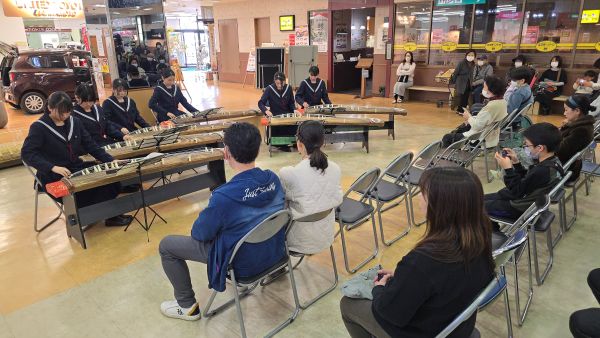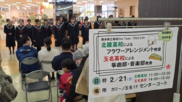 熊本県立高校One Teamプロジェクト事業の一環として、玉名高校箏曲部と音楽部の発表がカリーノ玉名のセンターコートで行われました。音楽部の発表では玉名高校校歌を久しぶりに聞くことができました。One Teamプロジェクト事業とは、県内の特色ある複数の高校が連携し、学校や学科の枠を越えて教育活動を行う取り組みで2022年度から実施されています。この日の午前中には北稜高校によるフラワーアレンジメント教室が行われました。